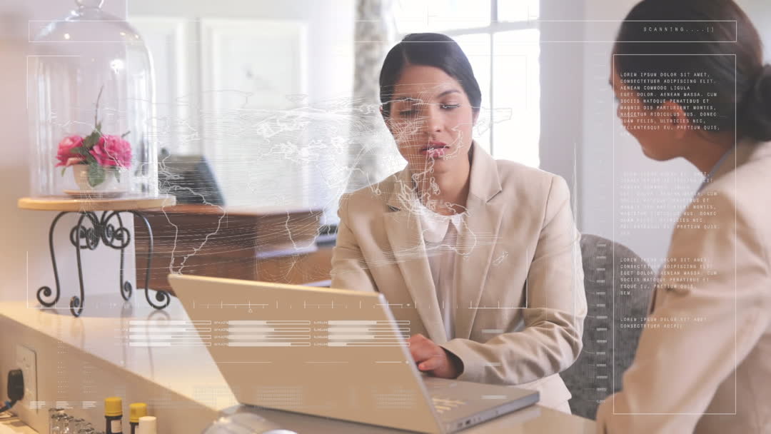 Business professionals in office discussing financial data processing with animation overlays illustrating global connectivity. Use for topics related to business analytics, data science education, collaborative work environments, or advanced financial tools applications.