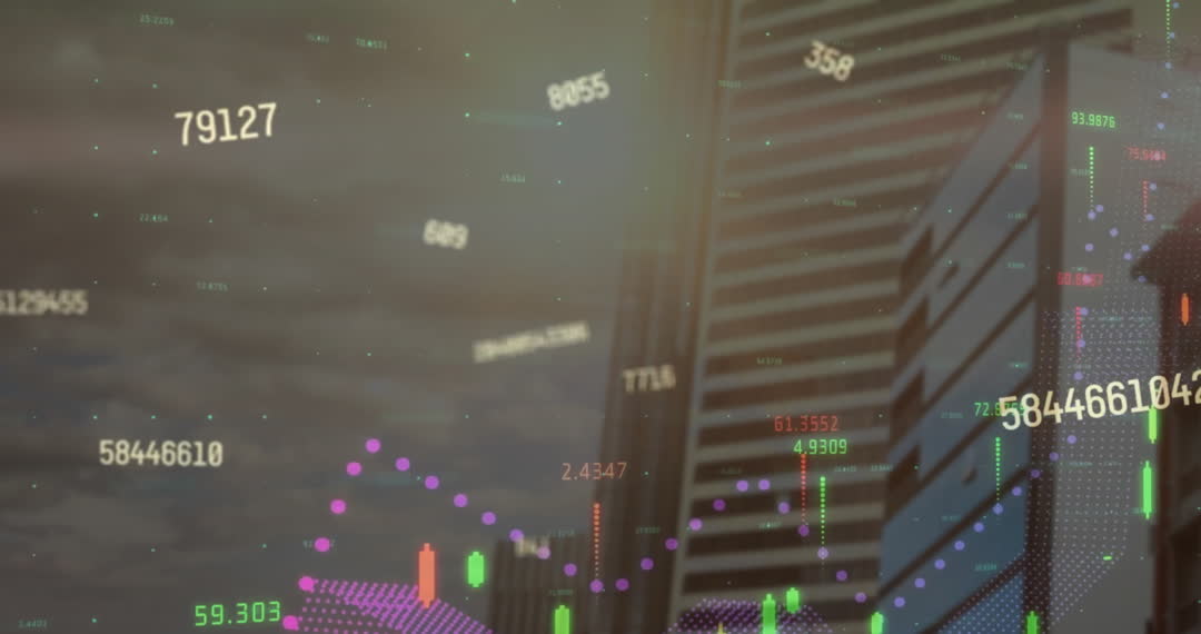 Animation of dynamic financial data visuals overlaying an urban city skyline, suggesting modern business analytics and data trends. Useful for presentations on finance, business development, and data-driven management strategies.