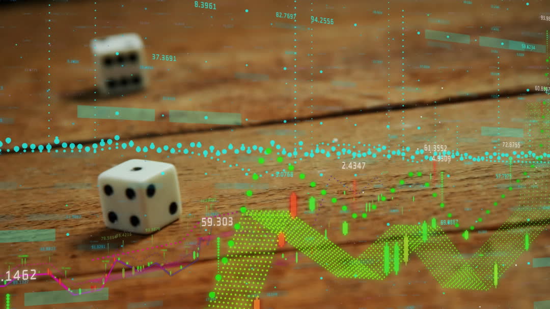 Dynamic visualization showcasing analysis of financial data against a backdrop of dice on a wooden table. Suitable for presentations on market strategies, investment tools, or educational content about financial risk and chance in both economics and gambling. Uses colorful graphs of market trends mixed with videory representing fortunes and risks associated with investments.