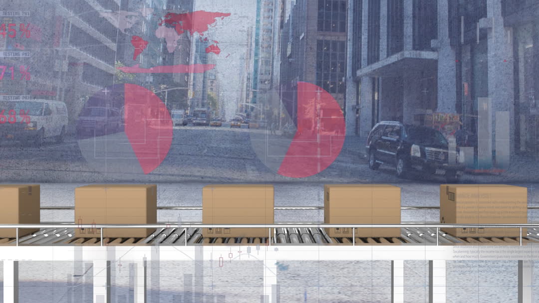 Animation depicting financial data processing with theme of global shipping and logistics, boxes on conveyor in urban environment. Suitable for business presentations, trade concepts and commercial industry visual content.