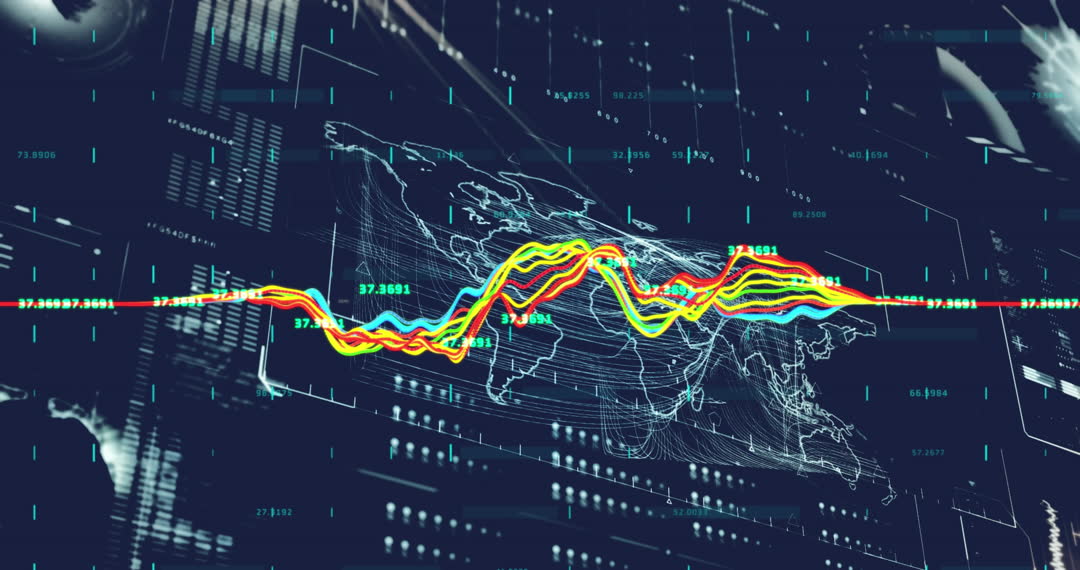 Visualization depicting complex data through colorful financial chart overlays on a global map. Ideal for illustrating global business trends, data analysis reports, or economic studies in finance publications. Hyper-digital environment makes it, and the use cases vast in tech visual communication.