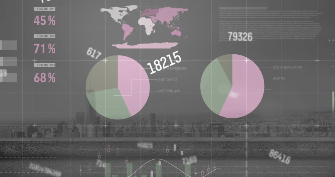 Visual representation of financial data analytics displayed against a backdrop of a cityscape. Incorporates pie charts, graphs, and maps suggesting business growth, market research, or financial analysis. Suitable for business presentations, marketing materials, or technology services that focus on data analysis and financial insight.