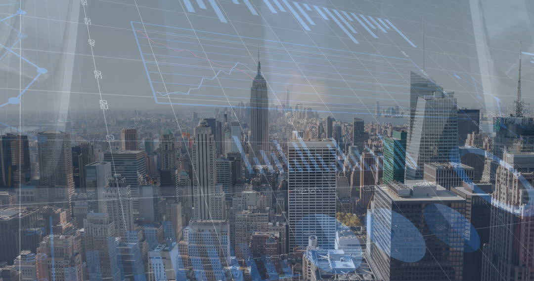 Visual of financial analytics over skyscrapers capturing concepts of urban development, global economic trends, data report insights, and market impact evaluations. Ideal for infographics, business adverts, and financial blog visuals.