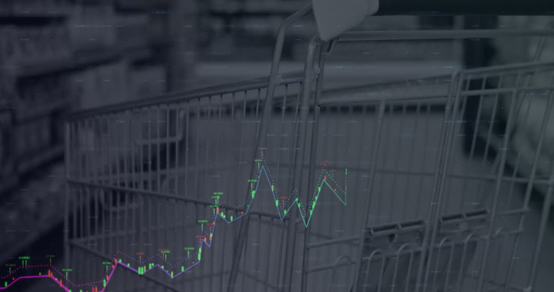 This video features an overlay of financial data graphs on a shopping cart within a supermarket setting, symbolizing the intersection of the stock market with consumer retail trends. It is ideal for use in contexts exploring economic forecasts, retail business strategies, global trading, consumer behavior analysis, or financial planning associated with the food retail market.