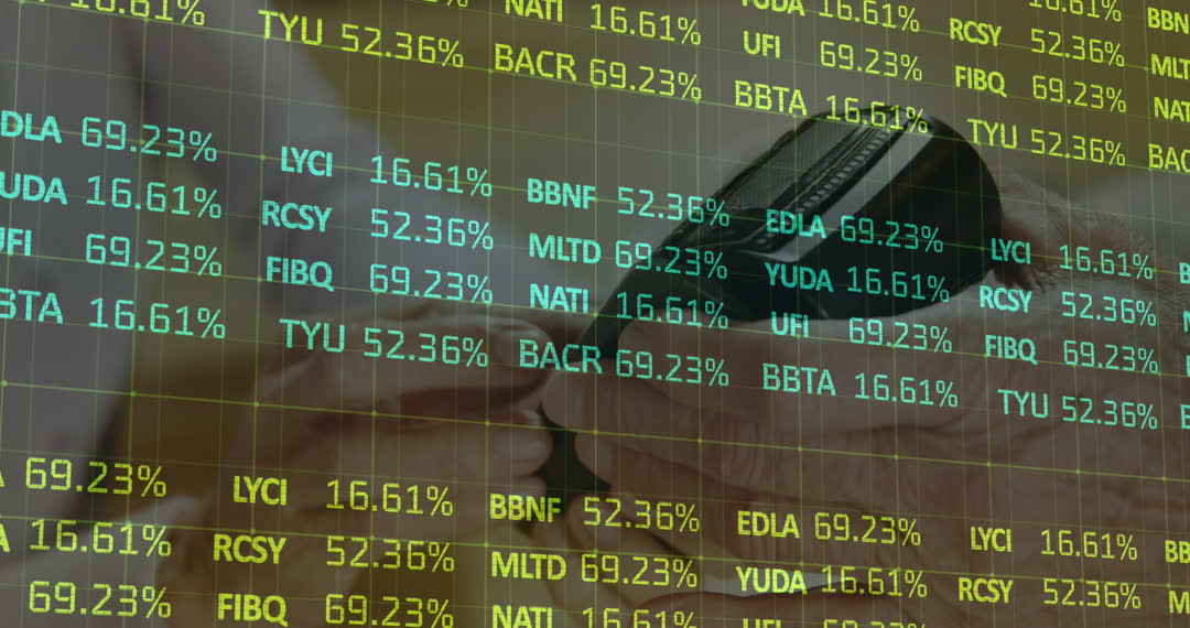 Digital display of financial data percentages superimposed over hands interacting with a mobile payment terminal, symbolizing modern cashless transactions and economic movement. Useful for illustrating concepts in articles, presentations on global finance, wireless payments, fintech innovations, and investment strategies.