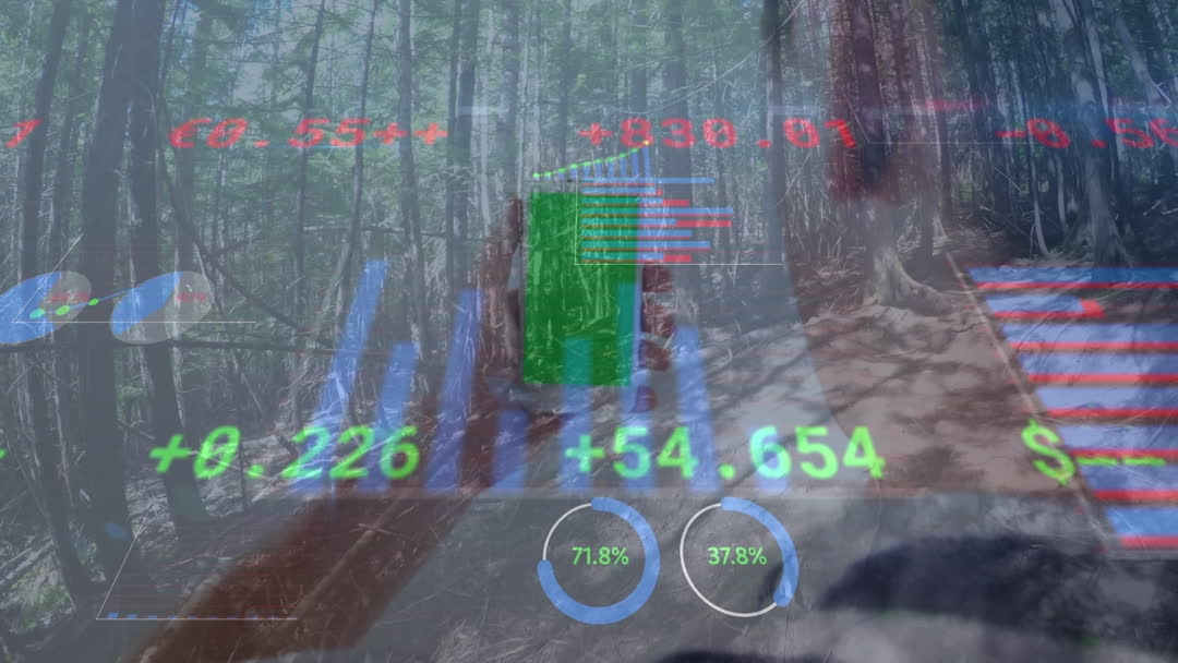 A forest serves as the serene backdrop for an animated composition of financial data graphics, juxtaposing technology and nature. Ideal for exploring themes of sustainable finance, digital economy, or environmentally conscious business initiatives. This visual can be used in marketing materials, technology blogs, or presentations highlighting eco-friendly strategies in finance.
