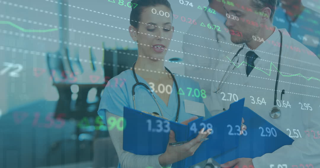 Image combines financial data processing with healthcare professionals, symbolizing integration of financial analytics in medical settings. Useful for illustrating topics on healthcare technology, financial management in healthcare, or innovations in medical data analysis. Ideal for articles or presentations on digital transformation in healthcare or financial healthcare trends.