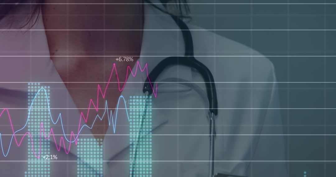 Image combines the healthcare sector with finance by overlaying financial data charts over the torso of a doctor with a stethoscope. Useful for discussing the impact of data analytics on healthcare, improved medical decisions through technological integration, or strategies for financial management in health sectors.