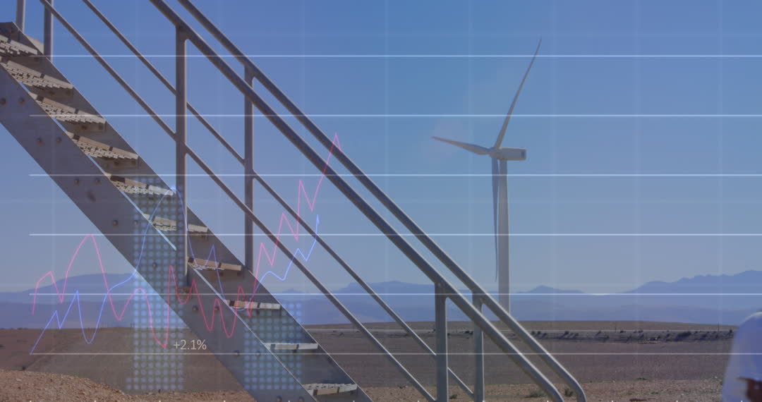 Digital animation showcasing financial data overlaid on wind energy videory, symbolizing the integration of renewable energy with business growth. Useful for illustrating topics related to sustainable finance, economic impact, and global energy trends in presentations, reports, or educational content.