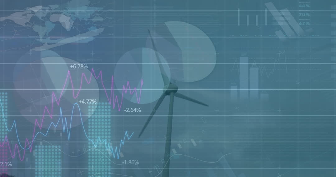 Dynamic visualization combines financial data analysis with an overlay of a wind turbine, symbolizing the synergy between technology and renewable energy. This videory can be useful for presentations, educational materials, or blog articles focusing on renewable energy investments, financial technology innovations, and sustainable business growth strategies.