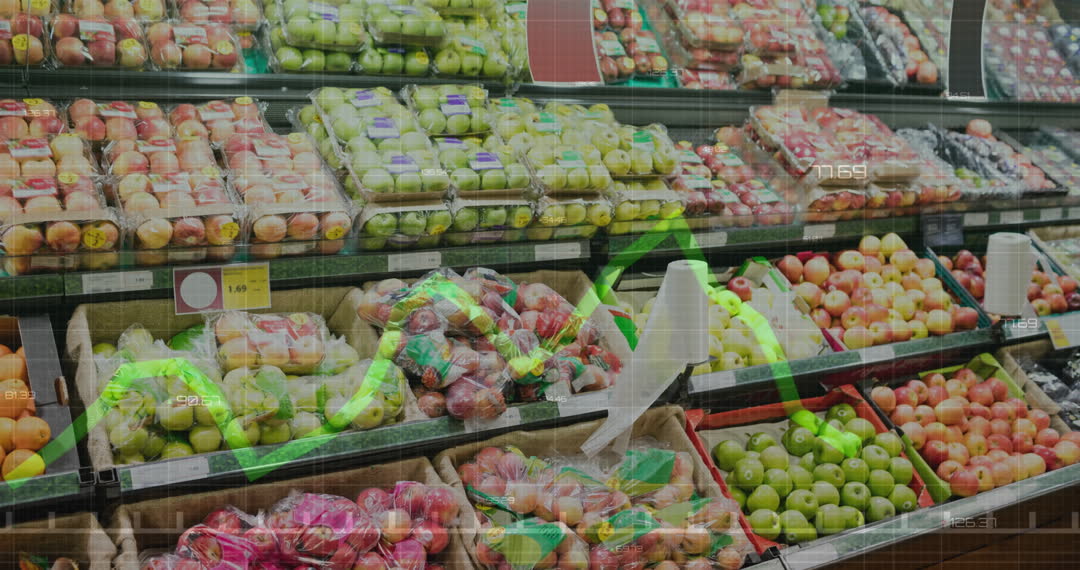 Dynamic video showing animated financial data and graphs superimposed on a colorful fruit and vegetable market. It illustrates concepts such as market trends, economic analysis, and finance. Suitable for articles and content related to financial analytics in the agriculture sector, discussions on market impacts, financial consultancy insights, and economic studies.