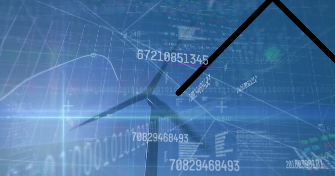 Visual representation combines financial data with wind turbines, reflecting the interplay between global finance, technology, and renewable energy. Great for illustrating concepts of economic forecasting, sustainable development, or environmental economics. Suitable for projects related to green finance or digital transformation in energy sectors.