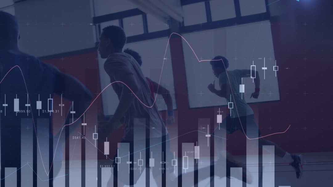 Basketball players running overlaid with stock market charts symbolizes the integration of strategy, performance metrics, and economic analysis in sports. Useful for illustrating concepts in market strategy, business optimization through sports analogies, and infographics related to performance analysis across different sectors.