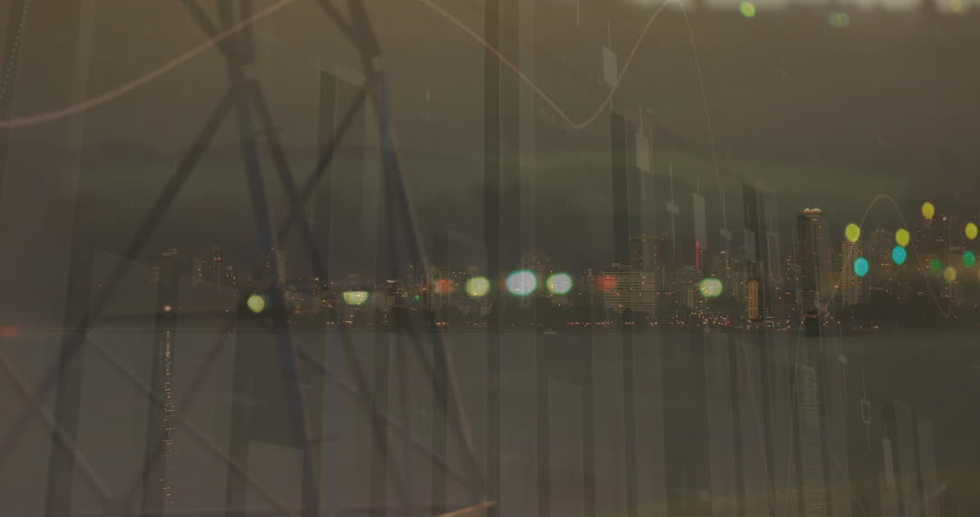 - Financial Data Overlaid on Cityscape at Night Creating Abstract Skyline