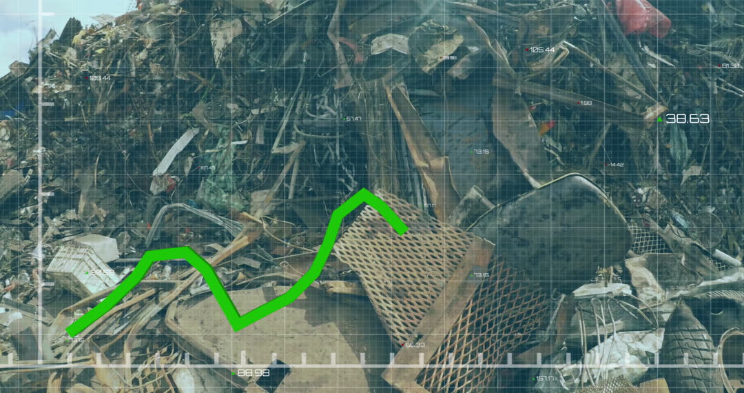Digital illustration showcasing economic statistics over a landfill suggests an interplay between environmental issues and financial themes. Useful for presentations or articles focusing on sustainability, waste management economics, or ecological statistics.
