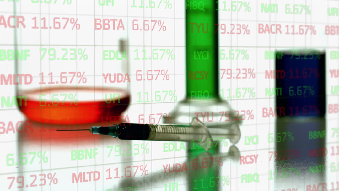 Visual emphasizes intersection of science and finance with videos of a syringe and laboratory chemicals overlaid with financial data, suggesting innovations in biotech financial markets. Ideal for illustrating themes of financial analysis, biotech investment, or technological advancements in science industries.