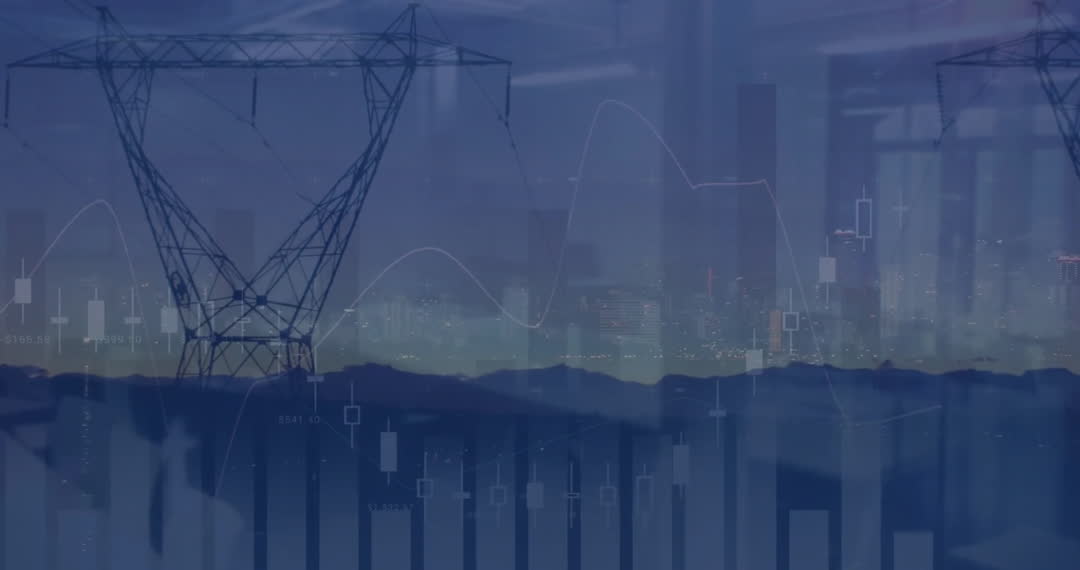 Electronic graphical layout of financial and economic analytics spontaneously breaking, processing data integrating in urban backdrops with electricity networks. Perfect for illustrating economic articles, energy industry updates, and technology-driven entities focusing on innovation and infrastructure.