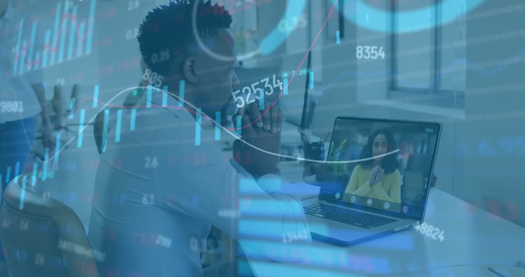 Combination of financial data visualization with people working in office. Team engaged in remote meeting fits themes of modern business dynamics, adapting to online tools during pandemic. Suitable for illustrating mixed effect of technology and finances in professional settings.