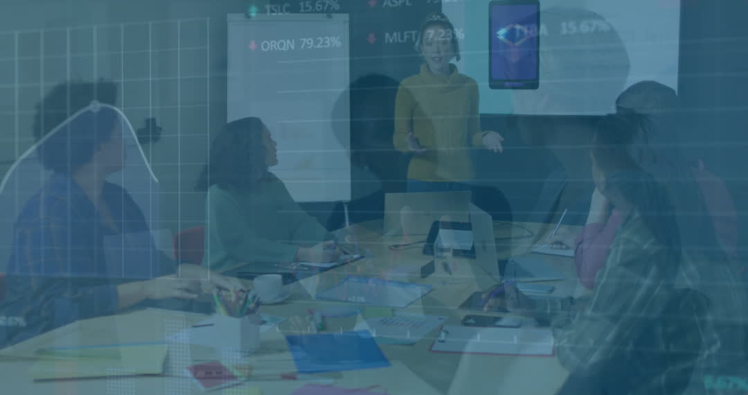 - Financial Data Overlay in Diverse Office Presentation Setting