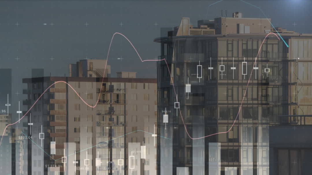 Digital animation overlays financial charts on a modern cityscape, symbolizing the intersection of global finance and urban development. Ideal for presentations, business materials, or articles related to economic growth, financial markets, and modern urban living. Useful for illustrating concepts in finance education or seminars.