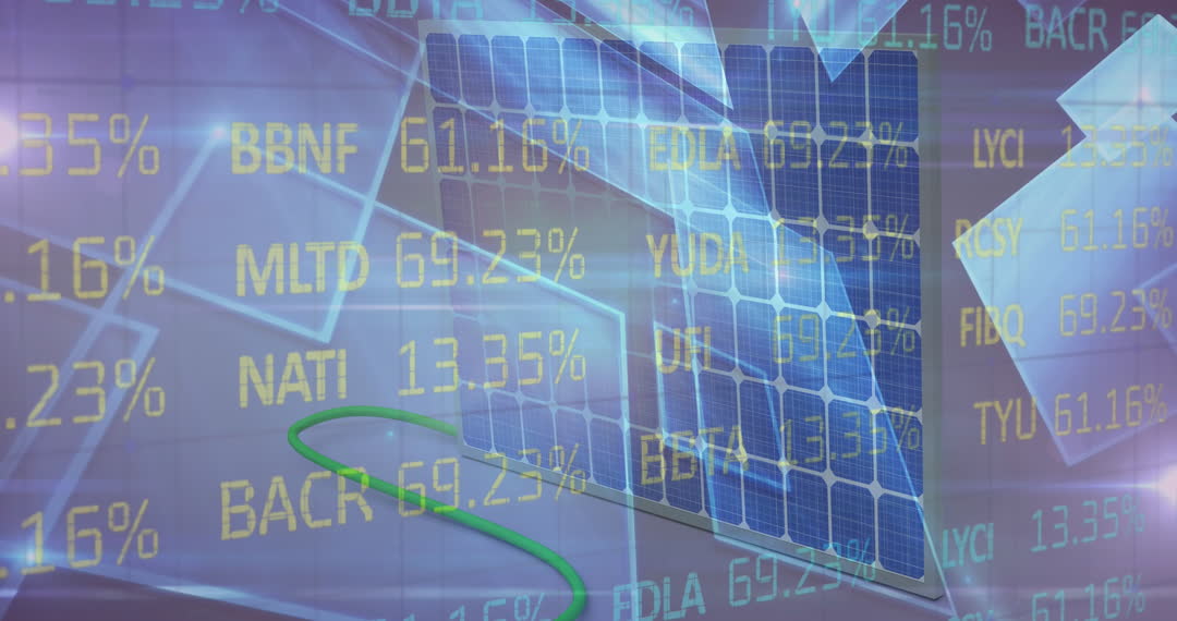 Animated overlay of financial data converting into values on digital solar panels, showcasing interaction of energy and finance sectors. Suitable for topics related to renewable energy investments, financial markets, sustainability technologies.