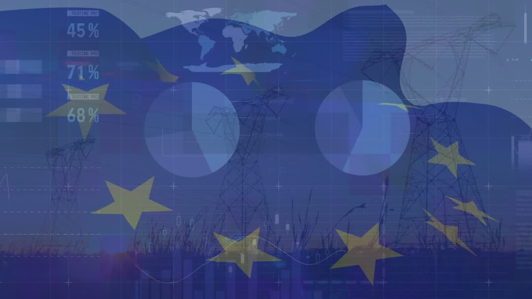 This conceptual video combines elements of the European Union with financial data visualizations layered over electricity transmission towers against a sunset. It symbolizes the integration of energy infrastructure and economic analytics, ideal for illustrating themes related to European energy policies, economic strategies, finance, power sector trends, and political forecasting.