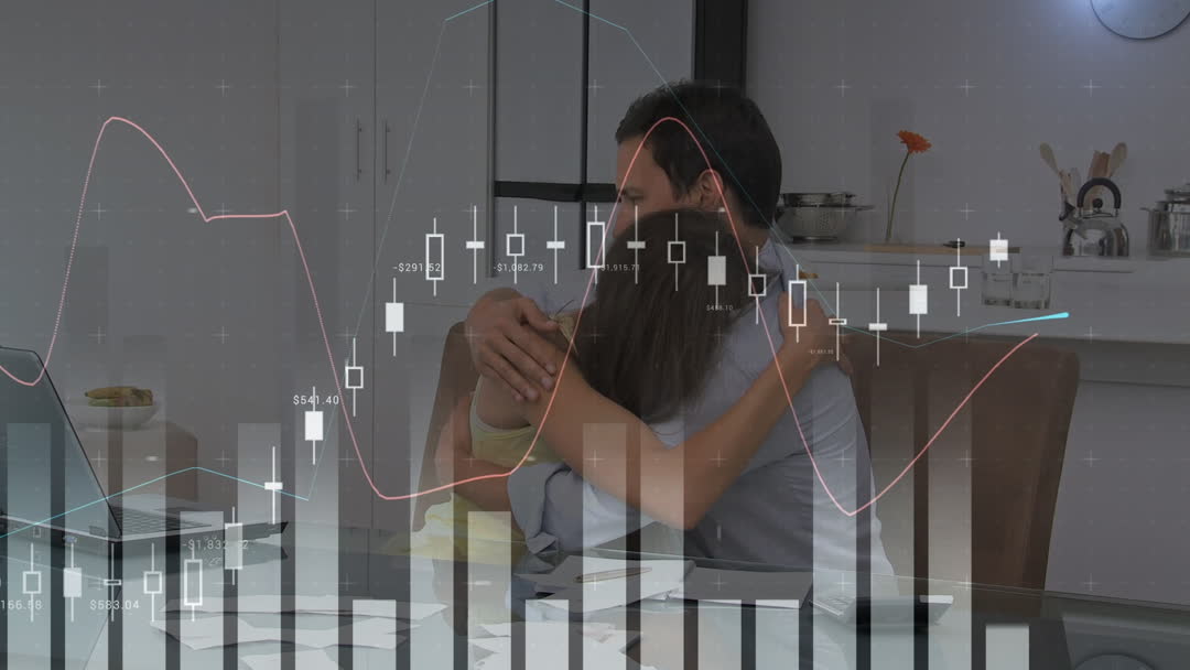 This video depicts a combination of a family embrace in the background with a digital overlay of financial charts and data. The merging of personal and financial elements can illustrate the impact of market changes on household dynamics and financial planning. It is ideal for articles or presentations about family budgeting, investment decision impacts on personal life, or humanizing financial content.