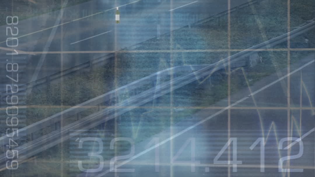 Animation shows financial graphs and data superimposed over highway traffic. Ideal for themes surrounding transportation economics, traffic flow analysis with financial applications, or studies on how economic trends affect transportation systems.