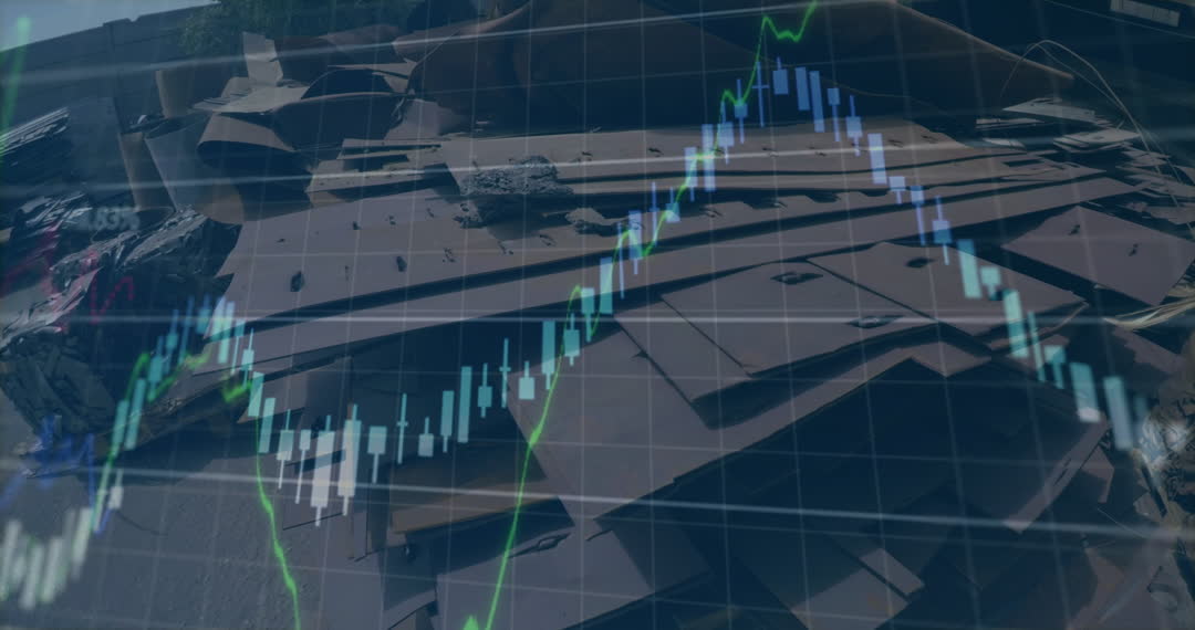 Image shows digital data graphs overlaying a scene of scrap metal in a junkyard. This visual represents the intersection of global economic trends and environmental recycling industries. Ideal for use in articles or presentations discussing the link between financial markets and sustainable business practices. Useful in contexts highlighting economic analysis, trade decisions, or the impact of commodities on global markets.