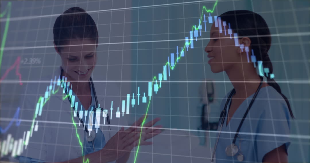 Features two female doctors engaged in conversation with an overlay of financial charts. Represents themes of the intersection between healthcare and technology, economic impact on medicine, and innovation in medical practices. Suitable for articles or presentations on modernizing the healthcare industry or illustrating discussions on economic trends in the medical field.