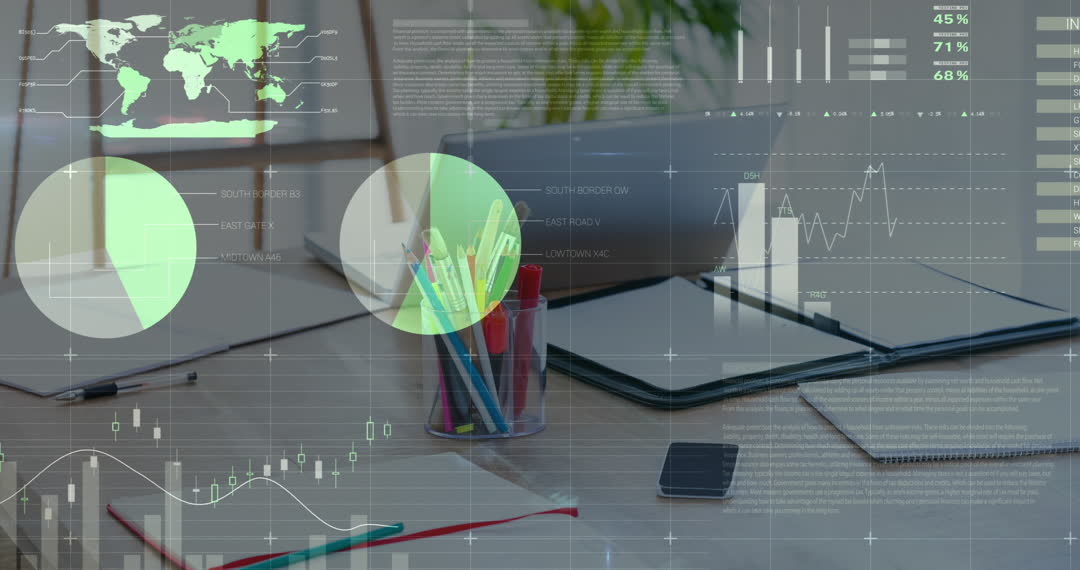 Visual of financial analytics overlays on office desk highlights productivity and business-oriented setups. Useful for illustrating concepts related to business, modern global finance, data analysis, and corporate environments.