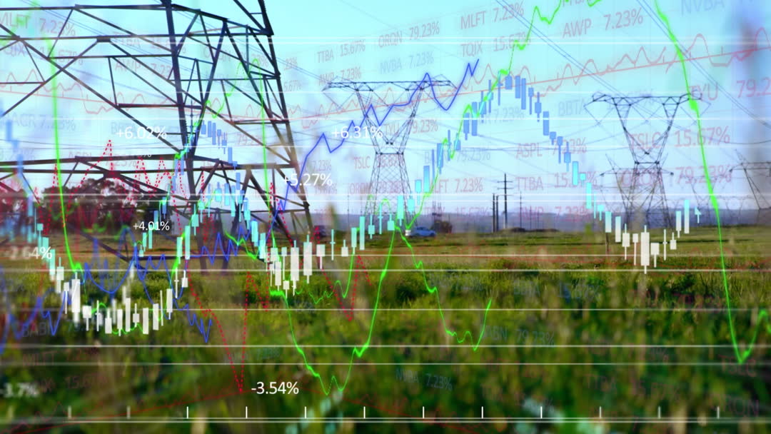 Visual fusion of financial graphs and power lines suggests connection between energy sector and market analytics. Useful in content related markets, economics, energy infrastructure analysis or corporate presentations.