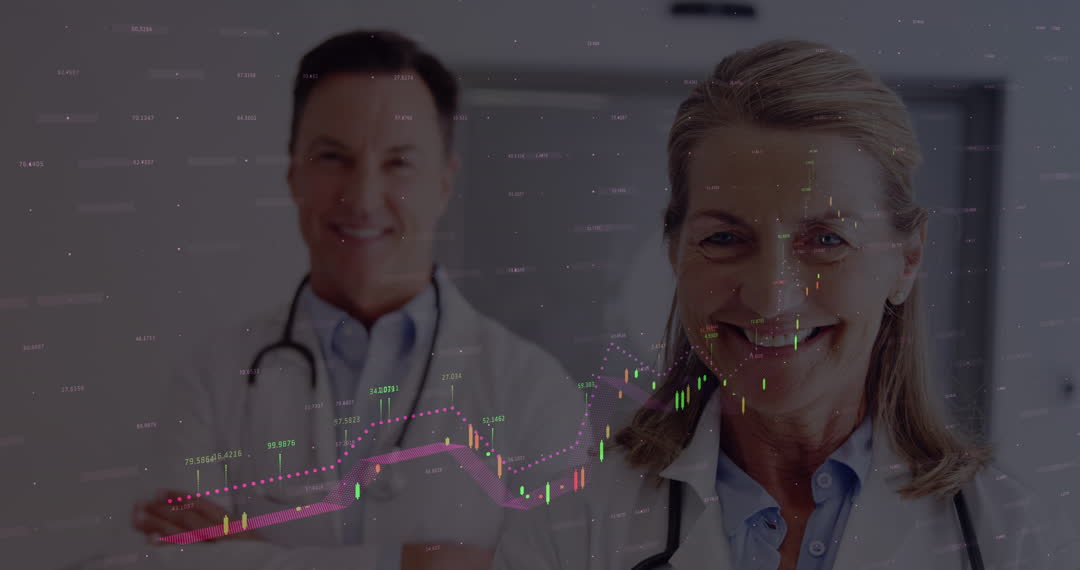 Two smiling and confident doctors wearing white coats projecting an video of professionalism and trust. Financial graphs overlaid, highlighting the intersection between the medical field and economic trends. Use for illustrating health economics, educational presentations on healthcare budgeting, and integrating medicine with financial analysis.
