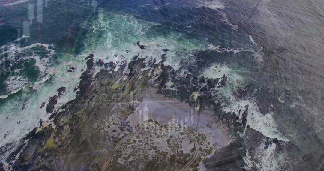 Aerial view of a rocky coastline merged with animated financial graphs and data visuals creates a unique blend of nature and technology. This dynamic composition symbolizes the intersection of natural environments with economic analytics and global sustainability efforts. Useful for illustrating themes related to the impact of global finance on natural settings or integrating modern technology into our understanding of environmental economics.