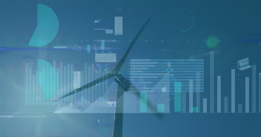 This dynamic animation depicts the intersection of renewable energy and financial analysis, capturing rotating wind turbines with overlays of charts and graphs. It is ideal for use in presentations on sustainable business strategies, renewable energy investment, climate change impacts on global finance, or educational content related to integrating technology and environmental solutions.