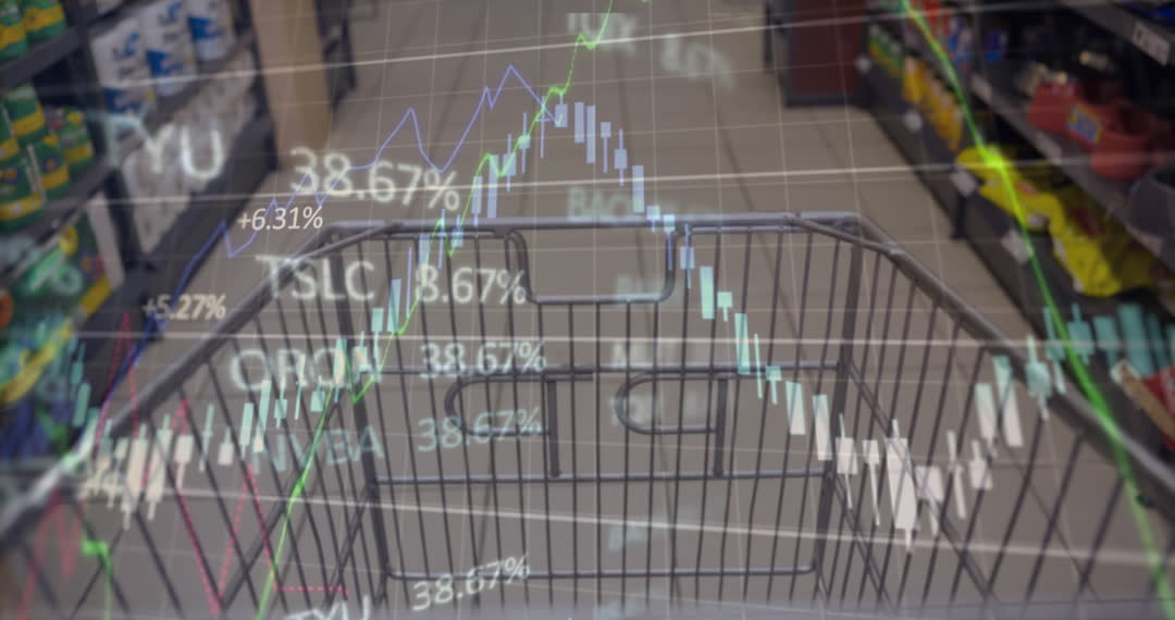 - Financial Data Overlay on Shopping Cart Symbolizing Market Trends