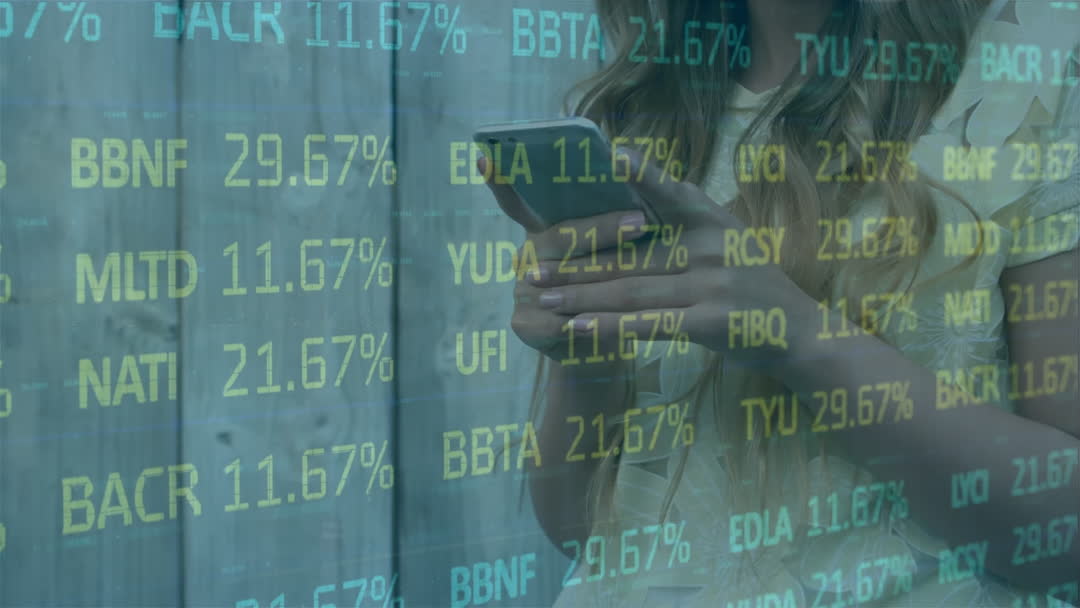 Financial Data Overlay on Woman Using Smartphone Indoors Video