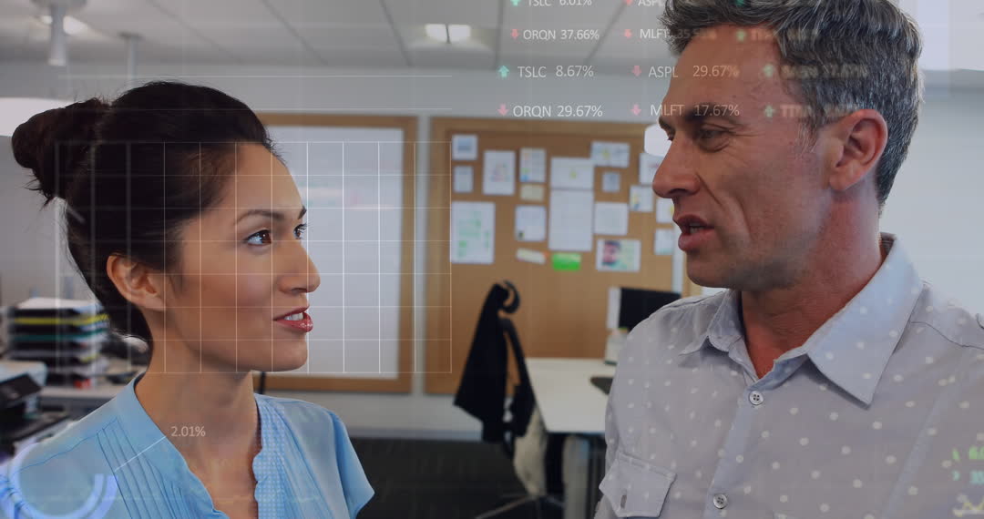 Professionals engaging in discussion with digital financial data overlay elements, illustrating teamwork and analytical collaboration in a corporate setting. Useful for depicting modern business workflows, presentations about financial technology, and articles on office culture and professional collaboration.