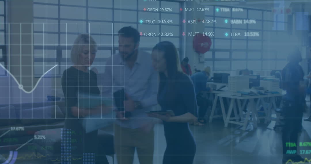Business professionals engage with digital technology in an office where projected financial graphs overlay the scene. This concept illustrates teamwork, analysis, and data integration in modern business environments, ideal for use in presentations relating to finance and teamwork topics.