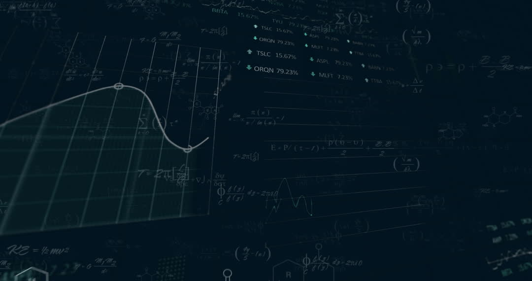 Animation shows dynamic interaction of financial data processing with mathematical equations across dark background. Useful for representing complex financial concepts, digital financial products, and business analytics in presentations. Ideal for educational uses, illustrating financial trends or mathematical data analysis tools.