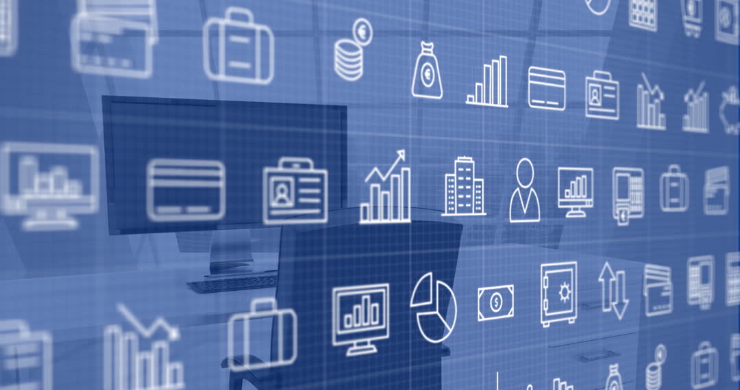 An office computer is seen with a virtual interface displaying various financial icons related to data processing. This illustrates concepts in business analytics, finance management, and cloud computing technologies. Ideal for use in presentations, articles discussing financial technologies, modern digital workplaces, or tutorials on data management and analysis tools.