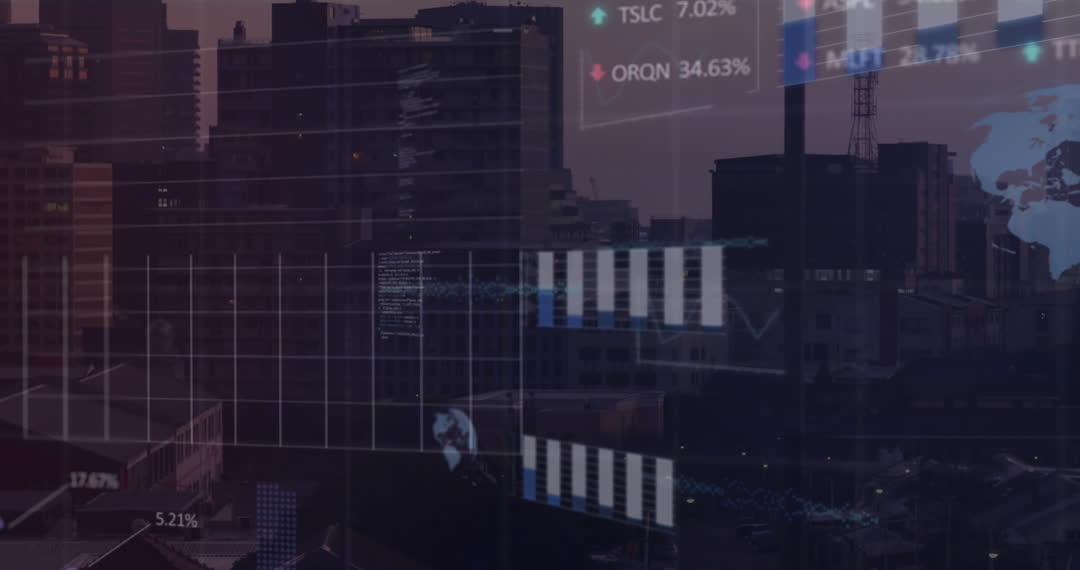 This concept represents the intersection of finance and technology, with animated financial data processing over an urban environment suggesting global business and economic analytics. Ideal for use in presentations, articles, or advertising related to finance, tech innovations in data systems, and urban economics systems.