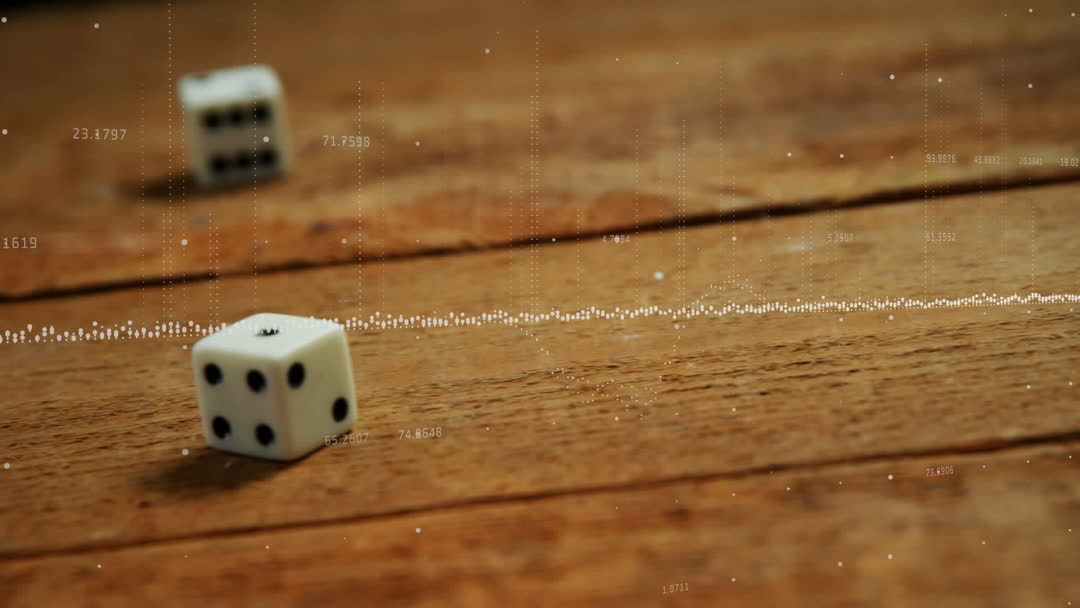 Combination illustrating finance and data analysis with videory of dice on wooden surface. Dice symbolize risk and chance, paired with digital financial elements. Ideal for presentations or articles on investing, analytics, data-driven decision-making, or market trends.