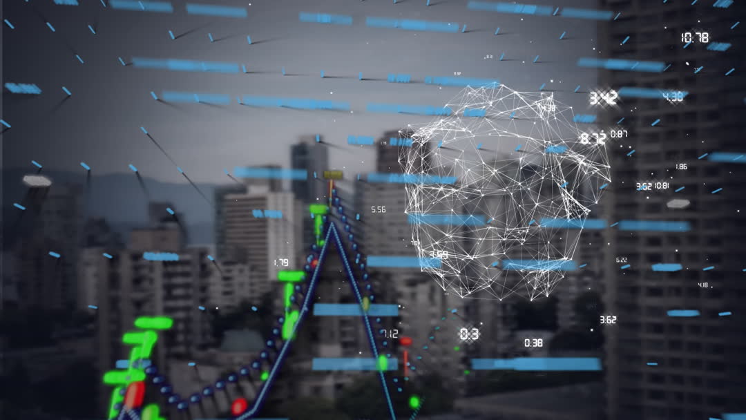 Digital animation displays abstract network globe and financial data over urban skyline. Perfect for illustrating concepts like global business analytics, data processing, and digital networks. Ideal for use in presentations, websites, or articles on technology, finance, or global trade.