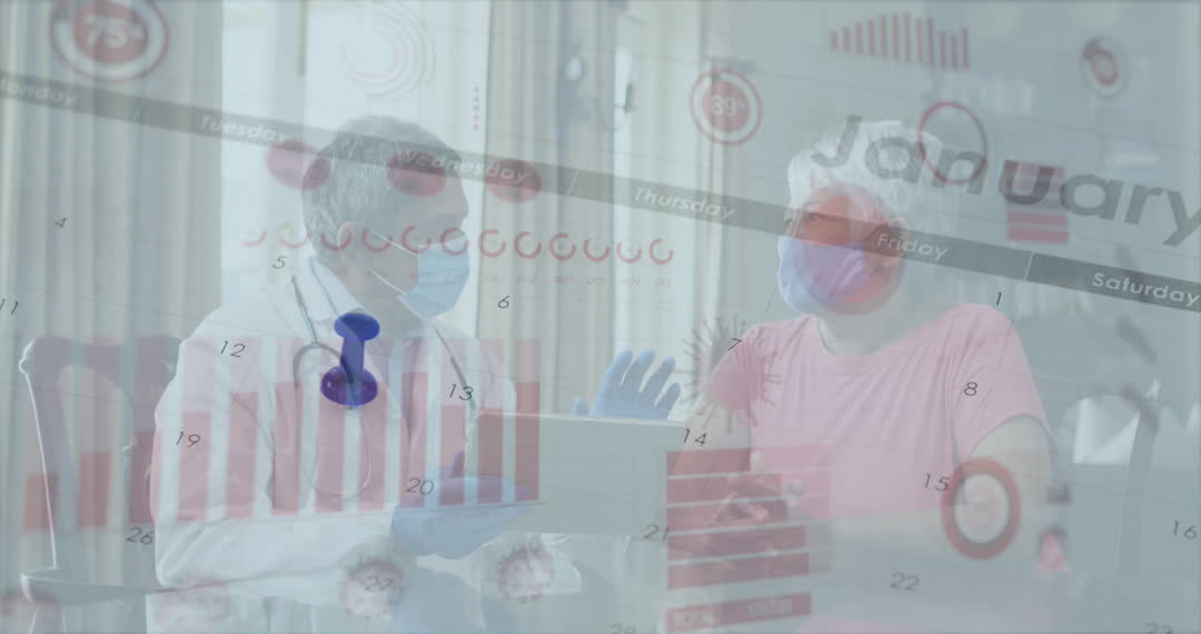 Double exposure of financial data graph over healthcare professional wearing mask and colleague high fiving, suggesting collaborative environment in business and technology application. Suitable for illustrating concepts of teamwork in financial and healthcare sectors, integrating business analytics with interpersonal cooperation and success.