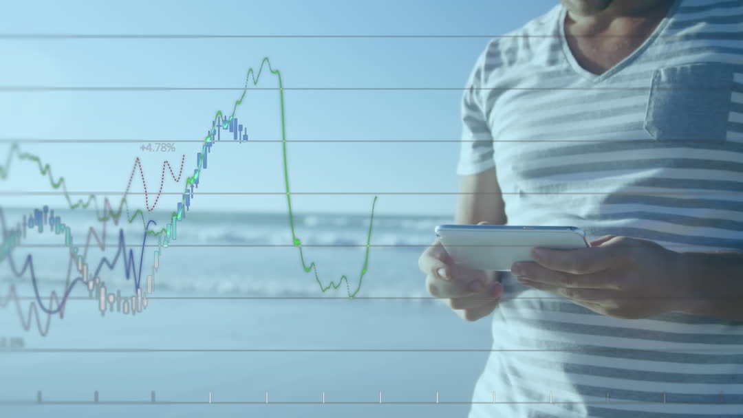 Visual representation of financial technology blending professional analysis and leisure. Useful for depicting modern work-life balance, remote business analytics, or showcasing technology in non-traditional environments. Great for articles about fintech, business flexibility, or investment strategies.