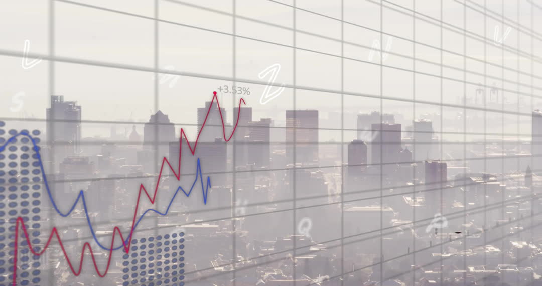 City skyline with overlaid financial statistics indicates dynamic business and economic growth in a global market. Suitable for articles on finance, urban development, global economy trends, or business analyses highlighting urban impact on economic landscapes.