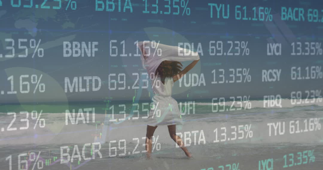 Depicts financial data superimposed on a beach scene with a woman holding fabric in the wind. Represents intersection of finance, travel, and technology, suitable for articles on global economics, technology impacts on tourism, and finance-related themes.
