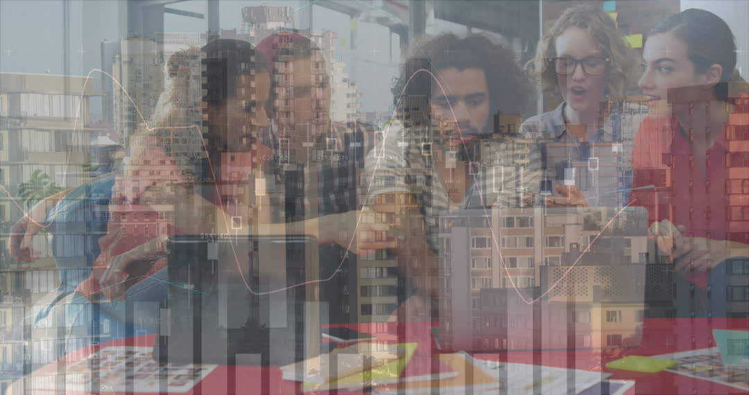 This video illustrates a blend of digital financial analytics over a cityscape, coupled with a diverse group of business people engaged in discussion. Ideal for portraying global financial themes, corporate business strategies, technology innovation, and multicultural team dynamics. It can be used for presentations, digital marketing in financial or business services, and articles focusing on urban development and digital transformation.