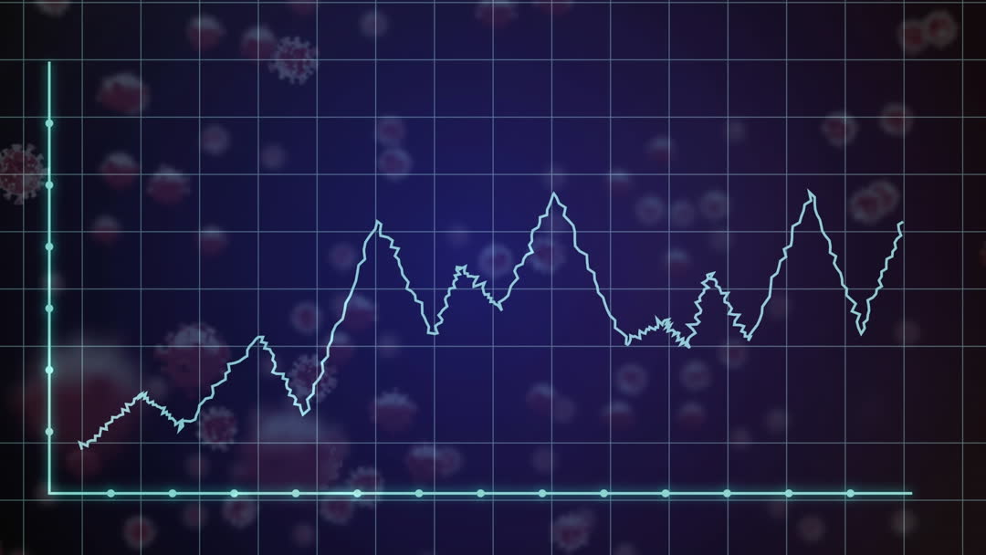 This visual depicts a fluctuating financial data graphic overlaid on a background featuring virus cell videory. Ideal for illustrating the connection between global health events and economic trends. Suitable for use in articles and reports on business resilience during pandemics, webinars on market impacts of viruses, or financial presentations detailing historic events and economic volatility.
